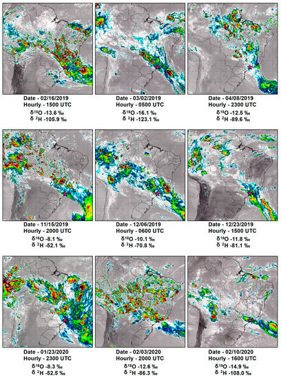 With the aid of GOES-16 satellite images in the infrared channel, it is possible to observe the range of cloudiness associated with positioning during SACZ events, as well as its magnitude (Figure 5). The SACZ positioning was mostly well defined, mainly referring to moisture transport from the Amazon region to southeastern Brazil, as well as identified with the retrograde trajectories of the HYSPLIT (Figure 4a). During the nine episodes that SACZ was active, individual isotopic values varied from a δ18O of −16.1‰ and a δ2H of −123.1‰ (during the fifth collection of the second event) to a δ18O of −8.1‰ and a δ2H of −52.1‰ (during the collection in the fourth event), as shown in Figure 5. In addition, d-excess varied individually from 1.7‰ (during the first collection in the second event) to 14.7‰ (during the second collection in the eighth event). Furthermore, in the first two SACZ events, the d-excess presented values below the average (Table 3). A joint analysis of the data suggests the d-excess increase may occur gradually, due to the total coupling of systems in the region for the SACZ formation [17]. For example, in the events that enabled the higher number of collections (events 5, 8, and 9), d-excess increased gradually (values shown individually in the Supplementary Material—Table S1).