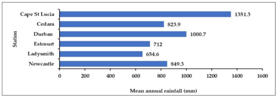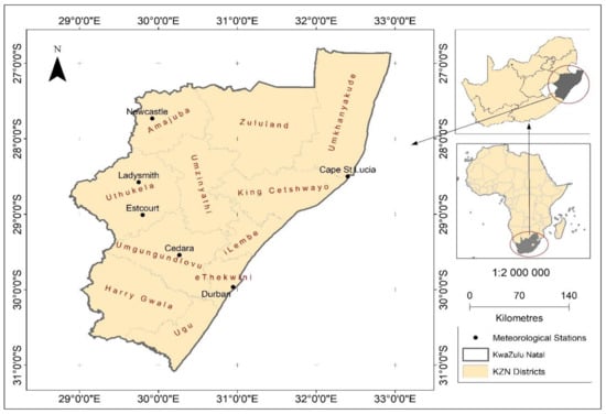 Rainfall and air temperature data from weather stations across KZN, covering three of the 24 South African climate regions were used for this study [15]. The climatic data used covers 49 years, 33 years, and 23 years per station, depending on the quality and duration of data available. The data were extracted from two meteorological stations per region, across the three regions of the province of KZN. The six stations are located at Cape St Lucia, Cedara, Durban, Estcourt, Ladysmith, and Newcastle (Table 2 and Figure 1).