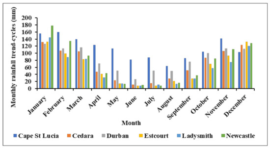 Monthly rainfall trends-cycles show a distinct steady decrease from January–February to June–July and a steady increase from thereon approaching the spring–summer seasons (Figure 3). These trend-cycles are seen across five of the six meteorological stations. Cape St Lucia shows well-distributed rainfall throughout the year, even during climatologically dry months with a low monthly rainfall amount in August (Figure 3) while other stations have their lowest around June and July (Figure 3). The lack of rainfall during autumn–winter months exposes the different regions to dry spells and drought periods between rainfall cessation and onsets, especially in Regions 7 and 12.