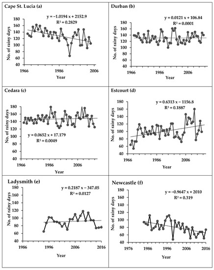Trends in the total number of rainy days per annum for the weather stations. (a) Cape St. Lucia; (b) Durban; (c) Cedara; (d) Estcourt; (e) Ladysmith; (f) Newcastle.