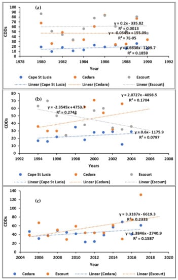 Trends in the highest number of CDDs per year for different timelines for three weather stations within three climatic regions in KZN. (a) 1980–1990; (b) 1994–2004;(c) 2004–2017.