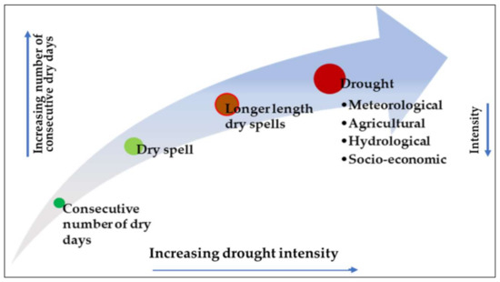 Drought periods and heatwaves are generally associated with oceanic–atmospheric interactions such as changes in sea surface temperatures and warm phases of the El Niño Southern Oscillation (ENSO) over southern Africa [8,9,10]. These other drought-associated atmospheric interactions over oceans range from typical anticyclonic conditions, cut-off low-pressure systems and tropical, temperate troughs [10]. However, studies by Richard et al. [11], Moeletsi et al. [12], Kane [13] and Rouault et al. [14] specifically relate South Africa’s rainfall variability to the ENSO, which is an indicator of climate variability. Further, Richard et al. [11] directly link more intense and longer-lasting drought and interrelated extreme weather events to such atmospheric–oceanic interactions, particularly the ENSO. Due to the influences of ENSO, a semi-arid climate, as well as climate-change-induced climatic variability and change, dryness is becoming devastating in South Africa [5,12].