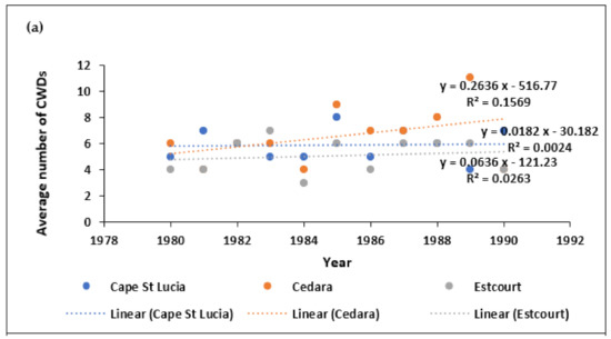 Cedara experienced the highest overall average number of CWDs compared to Cape St Lucia and Estcourt, which could indicate more potent seasonal wet spells for this area, though a slight downward trend in CWDs is observed in this area (Figure 7). In the case of Cape St Lucia, the number of CWDs had a non-significant increasing trend over one-time measurement period from 1980 to 1990 and a slightly decreasing trend between 1994 and 2004. Estcourt showed a very slight upward trend from 1980 to 1989 and a non-significant downward trend was observed thereafter, until 2006 where we start to see a slightly more visible downward trend. The non-significant trends especially during the 1980–1990 period are accompanied by weak correlation coefficients of the variables being studied and higher Significance F values more especially for the Cape St Lucia and Estcourt stations. The correlation improves during the 1994–2004 sub-period for all stations, however, the Significance F values remain higher, except in Cedara where a good correlation between variables as well as a low Significance F value is noted. A low Significance F value was also seen in Estcourt during the 2005–2017 time period, highlighting reduced significance. The trends have, therefore, been variable across the three stations examined, and trends seem to be localised.