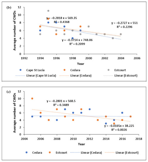 Trends in the highest number of CWDs per year for different timelines for three weather stations within three climatic regions in KZN. (a) 1980–1990; (b) 1994–2004;(c) 2004–2017.
