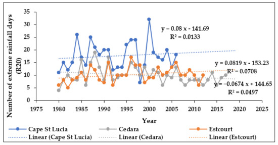 The number of extreme rainfall days (R20) per annum for three weather stations across KZN (1980–2017).
