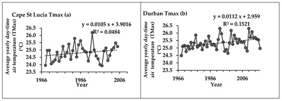 Trends in air day-time and night-time air temperature averages for the six weather stations representing three climatic regions in KZN over the years. (a) Cape St Lucia Tmax; (b) Durban Tmax; (c) Cape St Lucia Tmin; (d) Durban Tmin; (e) Cedara Tmax; (f) Estcourt Tmax; (g) Cedara Tmin; (h) Estcourt Tmin; (i) Ladysmith Tmax; (j) Newcastle Tmax; (k) Ladysmith Tmin; (l) Newcastle Tmin.