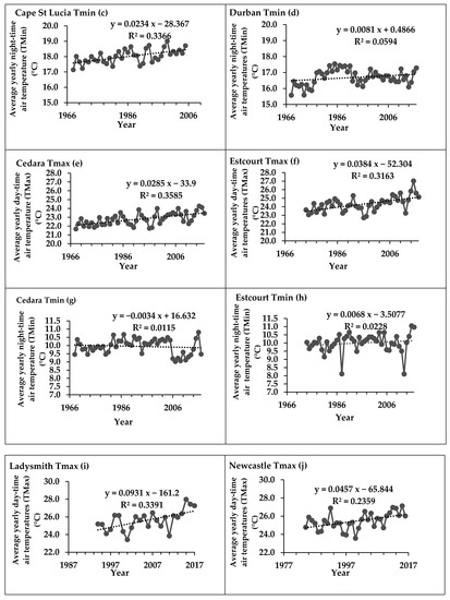 The number of warm days and nights are increasing while cold days and nights are decreasing and minimum air temperatures are increasing throughout KZN except for Cedara, where daily minimum air temperatures show a slight downward trend. In addition, warm spell durations are likely to increase in KZN and heatwaves may continue to become more prevalent. This may have impacts on the number of frost days in the winter season to which natural habitats may respond negatively. The increase in air temperatures is in line with the global trends, [16,26] and is not necessarily unique to KZN.