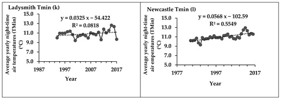 Stations in Ladysmith and Newcastle of Region 7 both showed upward trends in daily minimum air temperatures (night-time air temperature). The upward trend in night-time air temperatures alongside the upward trend in day-time air temperatures confirms increased warming in this region, which is in line with the widely recognized increase in air temperatures in the Southern Hemisphere and globally (Figure 9). Given that this is a dry region already compared to the other two regions, increased heat due to rising air temperatures will expose the region to more dryness and drought-like conditions. Newcastle is expected to be more affected because, in addition to the air temperature variations, this area also experienced a decrease in the annual number of rainfall days.