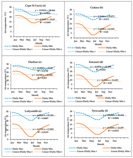 Maximum and minimum average air temperature (°C) yearly routine (s) (1968–2017) for six weather stations across three climatic regions in KZN. (a) Cape St. Lucia; (b) Cedara; (c) Durban; (d) Estcourt; (e) Ladysmith; (f) Newcastle.