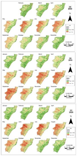 An assessment of moisture stress or hydrological drought over long periods also indicates how a place is getting dry and is an important indicator for drought [31]. The maps are shown in Figure 11 present changes in NDVI, a proxy of moisture stress, in KZN in 2000, 2010, and 2020. The overall moisture stress variation is an indicator of declining water presence in the province over the years, an indicator of worsening water scarcity, a situation which is projected to evolve from bad to worse in the near future.