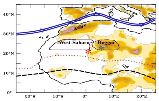 Map of West Africa with relief, July position of sub-tropical westerly jet (STWJ, blue line) [], maximum monthly mean rainfall (dashed black line) [], northernmost position of monthly mean rainfall > 25 mm (dotted red line) [], the contours of the West-Sahara and Hoggar regions (garnet), the Tamanrasset meteorological station (green star) and the supersite-1 of Bordj Badji Mokhtar during the Fennec experiment (red star). For the altitude, the isolines are given every 200 m from 400 m. Altitude above 1200 m (light purple).