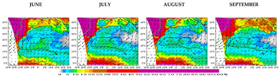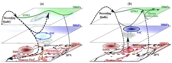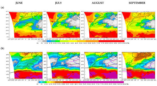 In Figure 2b, from June to July, the upper cloud cover, relative to total cloud cover, reduces not only in eastern Sahara, but also in western Sahara and the eastern Atlantic. Over the eastern Atlantic, as the descending branch of the Hadley cell pushes the mid-latitude flow northward, in the upper troposphere, clear sky frequencies above 95% become frequent (COF < 5% in Figure 2a). Over western Sahara, which is located between the two subsidence maxima related to the descending branch of the Hadley cell and to the Tibetan anticyclonic circulation, the frequency of high cloud does not reach the minimum values observed over eastern Sahara and the eastern Atlantic. In August, the high-top COF increases again over the East Atlantic and over the western Sahara. The STWJ begins to migrate southward and with the relaxation of the high pressure belt mid-latitude lows can penetrate farther south making the environment favorable for possible outbreaks of tropical moist air into the subtropical mid and high troposphere and occurrence of high clouds in these regions [,,].