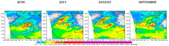 Figure 2a,b show monthly average maps of total COF and high-top COF. Figure 2b also gives the regions where maxima of geopotential height at 200 hPa and 100 hPa are the most frequently located (indicative of the Tibetan anti cyclone position; see Section 2 for the definition of these regions) and the boundary between the easterly and westerly winds at 200 hPa (the zero isoline of 200 hPa zonal wind). In Figure 2b, the northern boundary of the high-top cloud cover due to the ITCZ convective activity approaches 18° N during the pre-onset period in June and reaches 20° N during the monsoon peak in August []. This limit is close to the northern end of the precipitation belt (Figure 1) (Lélé et al. []). Linked to the ITCZ move, in the upper troposphere and mid-troposphere the easterly wind regime move also north (see the boundary between westerly and easterly wind in Figure 2b). In September, east of 10 W, the northern limit of the high-top cloud cover returns to its June position, but west of 10 W, this limit remains close to 20° N. This may be related to the African Easterly Wave (AEW) regime, which peaks in September along the west coast of North Africa [].