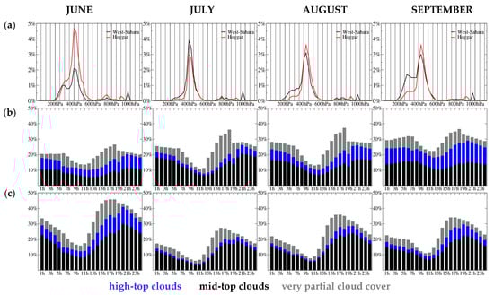 Figure 5a shows the distribution of cloud top pressure over western Sahara and the Hoggar. In this distribution, the peak at 400 hPa indicates that the cloud cover is preferably at this altitude which is close to but above the SABL top in agreement with observations from lidar data (see Appendix C and [,,,,,]). In July, when the frequency of high-top clouds is low (Figure 2b), the distributions are reduced almost to a single peak, whilst in June and September over the West-Sahara, a secondary peak appears at 275 hPa.