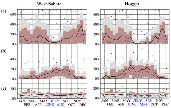 (a) annual cycle of the distributions of high-top daily cloud cover occurrence frequency (DCOF) distributions built over 15 day periods for West-Sahara (left) and Hoggar (right). (b,c) same as (a) but for mid-top DCOF and daily very-partial cloud cover occurrence frequency (VP DCOF), respectively. Each 15 day distribution has been partitioned in three parts, using the 5% percentile, 15% percentile, 85% percentile and 95% percentile. The brown areas span the part of the distribution within the 15th and 85th percentiles, the gray areas span the part of the distribution within the 5th and 95th percentiles. Dashed black lines indicate the 50th percentile, solid black lines indicate the 70th percentile, crosses indicate the maximum values.