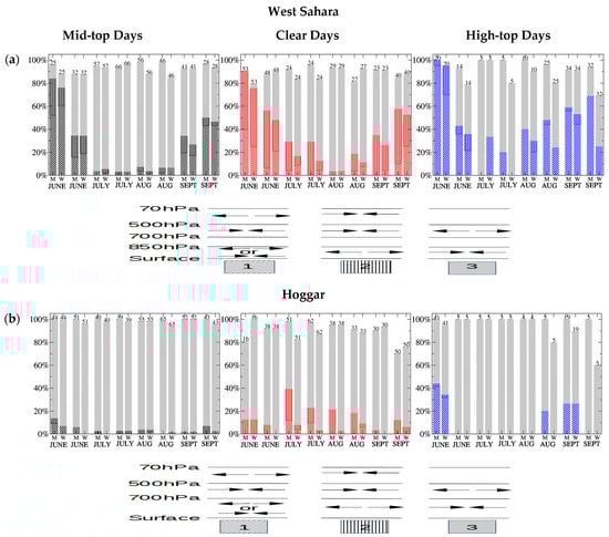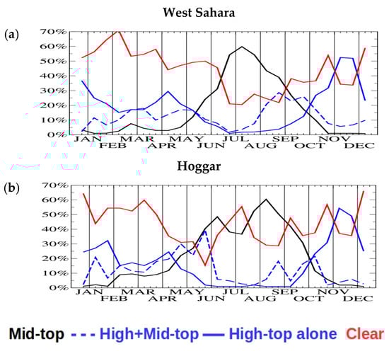 (a) Frequencies of mid-top days, high-top days and clear days for West-Sahara. (b) Frequencies of mid-top days, high-top days and clear days for Hoggar. For the 2008–2014 period and 15-day periods.