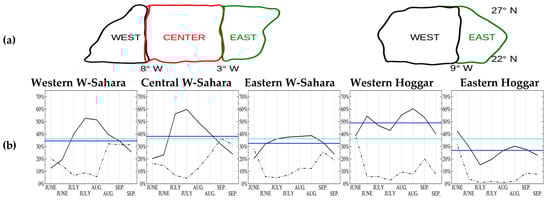 (a) Maps of the division of West Sahara in 3 sub-regions and of the Hoggar in 2 sub-regions. (b) Frequencies of mid-top days (solid line) and high-top days (dashed-dotted line) for each sub-region and for 15 day periods. Average frequency during JJAS (June to September) over the sub-region (blue line) and mean of the average frequency of the 2 Hoggar and 3 Western Sahara sub-regions (turquoise line).