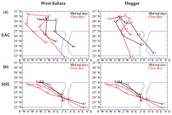 For both regions in Figure 9, the SHL barycenter and the SAC barycenter during mid-top days and during clear days migrate to the north-west as was observed on the monthly mean maps (Figure 3) and then retreats to the south-east at the end of August. Figure 9 shows also that the SAC barycenter moves further north and reaches the Atlas foothills, while the SHL barycenter remains south of 27° N at the limit of West-Sahara (Figure 9b). In both cases (mid-top days and clear days), the SAC intensity value increases until the end of July and then decreases (Figure 11a). The SHL also intensify until the end of July and then decreases.