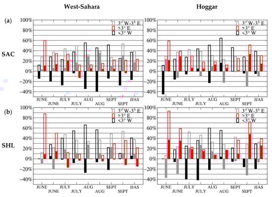 (a) For the SAC barycenter for mid-top days, occurrence frequency of the barycenter longitude on the west of 3° W (yellow contour), between 3° W and 3° E (cyan contour) and on the east of 3° E (brown contour). (b) For the SHL barycenter and for mid-top days, occurrence frequency of the barycenter longitude on the west of 3° W (yellow contour), between 3° W and 3° E (cyan contour) and on the east of 3° E (brown contour). The fill part of the bar gives the difference in frequency between mid-top days and clear days. Data estimated over 15 days periods. Information is given for West-Sahara (left column) and for Hoggar (right column).