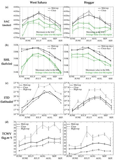 The mean ITD positions south of Hoggar and south of West-Sahara on their northward migration and southward retreat are slightly further north during the mid-top days than during the clear days, except in early August for the West-Sahara (Figure 11c). However, the variability around the mean values is large. High-top days coincide with a large northward shift of the ITD during the second half of the summer (Figure 11c). Whilst the maximum values of the SHL and the SAC intensity decrease from the beginning of August, the ITD continues to move northward and the TCWV values continue to increase until the end of August.