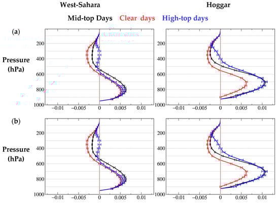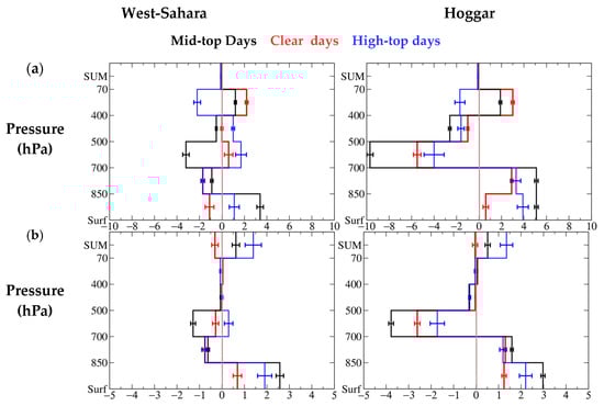 As shown in Figure 11d, TCWV exhibits significant differences between clear days (smallest value), mid-top days (intermediate value) and high-top days (largest value). These differences are driven by three sources and sinks: surface evaporation, precipitation and horizontal water convergence. In the arid conditions of the West-Sahara and the Hoggar regions, surface evaporation is a negligible source of moisture. Precipitation is also very weak except during very few isolated events (e.g., Cuesta et al. []) having little effect at the scale of half a month. Water budget depends essentially on water advection at various levels, which, in turn, depends on air mass advection. In this section the mass flow rate of water vapor entering over each domain (see Section 2.3) within five broad layers spanning the whole troposphere (surface 850 hPa, 850–700 hPa, 700–500 hPa, 500–400 hPa, and 400–70 hPa) and the air mass convergence over the domains (using plots of the vertical profiles of the average vertical mass flux over the domain) are examined. These five broad layers have been chosen to capture the main characteristics of the SABL [,]. For the Hoggar, because of the high relief, daily surface pressure varies between 850 hPa and 960 hPa, with 8% of the grid points between 875 hPa and 850 hPa and 34% between 900 hPa and 850 hPa. As a consequence, 900 hPa is the lowest pressure level of the atmosphere for which values are given. In order to avoid any interference with our study of mass flux convergence and divergence, we chose the layer Surface-700 hPa as lowest layer over the Hoggar. The top of this layer (700 hPa) is well above the surface.