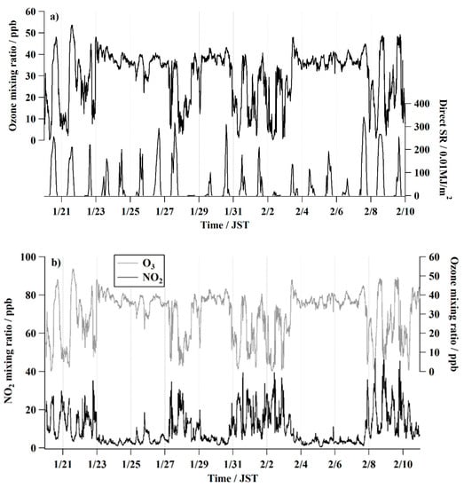 Figure 2a shows the ozone concentration (mixing ratio) and the direct solar radiation. Ozone showed diurnal variation and was high during the day and low in the morning and at night from 20–22 January, 27–28 January, 31 January to 2 February, and 8–10 February. During the same periods, the diurnal variation of ozone corresponded to direct solar radiation, indicating that ozone was primarily produced by photochemical processes. From 23–26 January, 29–30 January, and 3–7 February, the ozone concentration variation was relatively small (approximately 40 ppb), but the direct solar radiation showed diurnal variation, indicating that the ozone concentration was determined by factors other than photochemical processes. We considered that ozone was produced outside of the city and was transported to Fukuoka over a long distance. The concentrations (mixing ratios) of NO2 and ozone are shown in Figure 2b. Ozone and NO2, for example, show an anticorrelation from 20–22 January, indicating that titration occurred between ozone and NO to produce NO2, as chain reactions occur under solar radiation. From 23–26 January, 29–30 January, and 3–7 February, the NO2 concentration was low, and the variation was relatively small.