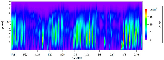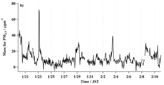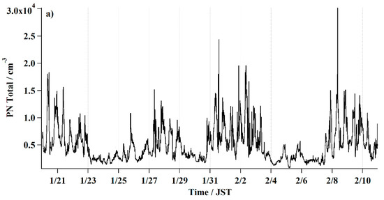 The PN of the diameter range from 10–500 nm is shown in Figure 3. The PN concentration of Dp < 200 nm periodically varied from low (approximately 300 cm−3) to high (15,000 cm−3) from 20–22 January, 27–28 January, 31 January to 2 February, and 8–10 February, which correspond to the periods when the ozone diurnal variation was observed. The total PN also showed a similar variation with ozone concentration, indicating that secondary particles were produced and grew into larger particles. Low PN concentrations were observed from 23–26 January, 29–30 January, and 3–7 February (Figure 4a). The low PN concentrations corresponded to periods in which the ozone concentration variation was relatively small (approximately 40 ppb). Figure 4b shows the mass concentration of PM2.5 which, unlike the PN concentration, did not show a clear variation.