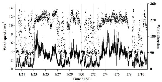 Figure 5 shows the wind speed and direction. The wind speed changed periodically. For example, the 10 min average was low from 20–22 January and high from 23–27 January. The wind direction also changed. Easterly and westerly winds were mixed from 20–22 January, whereas westerly winds were primarily observed from 23–27 January. The variation in wind speed corresponded to the variation in ozone concentration. At low wind speeds, ozone showed diurnal variation, whereas ozone showed relatively low variation at high wind speeds.