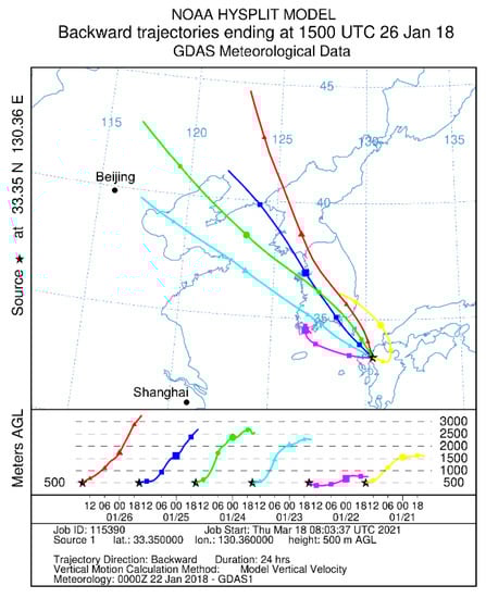 Backward trajectories (BT) were calculated using the vertical motion mode of the Hybrid Single-Particle Lagrangian Integrated Trajectory (HYSPLIT) model and the Global Data Assimilation System meteorological dataset [17,18]. Trajectories started at an altitude of 500 m, and the BT was calculated for 72 h. A positive matrix factorization (PMF) analysis was applied to the mass spectra of organics which was originally developed by Paatero and Tapper [19] and Paatero [20], and a customized evaluation tool (version 2.04) for AMS was developed by Ulbrich et al. [21]. The interpretations in the current study followed previous results [22,23,24].