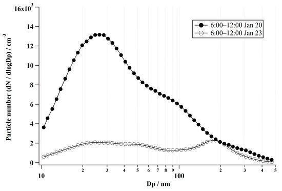 One of the highest PN concentrations in Group A was observed in the morning (6:00–12:00, 20 and 21 January). The PN of Dp was less than 50 nm, and was therefore considered to be very high (18.056 cm−3, 8:30 on 20 January). Figure 7 shows the particle size distribution measured using SMPS in the morning (6:00–12:00) on 20 and 23 January. The PN of Dp < 100 nm (ultrafine particles; UFPs) was much higher on 20 January in Group A (LAP, 13.126 cm−3 at Dp = 26.4 nm) than on 23 January in Group B (TAP, 2056 cm−3 at Dp = 26.4 nm). This was probably due to local emissions from car exhaust during rush hour and the accumulation of UFPs of Dp < than 100 nm due to the stagnant conditions caused by low wind speeds. Because of the winter season, an inversion layer may have formed during the night, causing the accumulation of air pollutants. Hasegawa et al. [25] measured roadside concentrations in Kawasaki City, Japan and found that particles with Dp = 30 nm disappeared after particles passed the thermal denuder at 250 °C. At this juncture, particles with Dp = 90 nm remained after thermal denuder treatment. Fushimi et al. [26] confirmed that particles with Dp = 30 nm consisted of volatile organic carbon from diesel vehicles, suggesting that the PN of UFP is due to local emissions from car exhaust which causes higher PN in the LAP. Thus, local emissions contribute to the increase in UFPs. The PN in the TAP period contains much fewer UFPs than that in the LAP period. During long-distance transport, the UFP particles probably coagulate and/or adsorb existing particles to form larger particles.