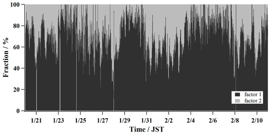 The fractions of Factor 1 and Factor 2 are shown in Figure 8. As expected, Factor 1 (LV-OOA) was dominant in group B (TAP). The fractions of Factor 1 and Factor 2 in TAP were 66% and 34%, respectively. The fraction of Factor 2 increased in Group A (LAP) and reached 44%, compared to that of 34% in TAP.