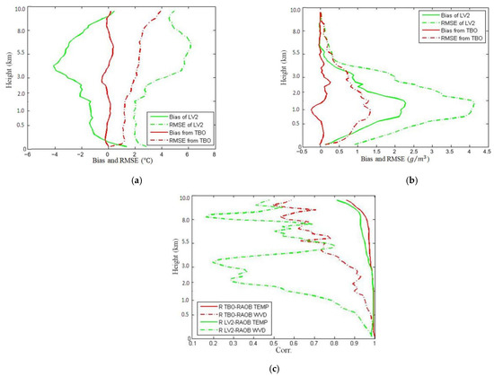 - From Figure 1a, the LV2 temperature bias was negative overall (solid green line), with a bias of −4 °C at the height of 4.4 km, implying that the retrievals from the radiometer system provided by the manufacture are generally cooler than the RAOB, and the RMSE of the temperature (green dotted line) was greater than 2 °C at each level, even reaching 6 °C at the height of 5.5 km.