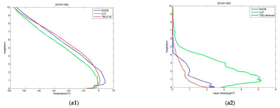 In Case 2 (Figure 2b), the temperature (red line in Figure 2(b1)) coincided with the RAOB at almost all heights, especially the tropopause height; the water vapor density line (red line in Figure 2(b2)) showed an advantage over the LV2.