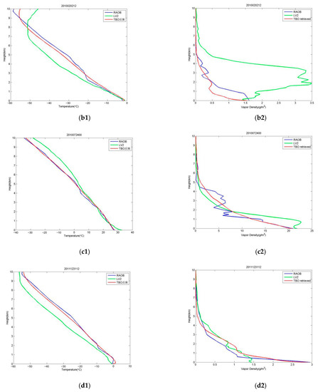 Figure 2a,b,d shows that LV2 lines (green) are notably different from the RAOB for both temperature and humidity. One can see that Figure 2(a1) is a typical boundary layer temperature inversion. The height and severity of the inversion layer revealed by LV2 (green line) are lower and weaker. LV2 in Figure 2(b1,d1) are close to the RAOB near the ground but too cool in middle troposphere, and the tropopause heights defined by LV2 are also lower than the RAOB [31]. As shown in Figure 2(a2,b2), LV2 almost always presents an erroneous “moisture layer” suspended in midair, and the maximum humidity value is much larger than the RAOB. Figure 2(d2) shows that LV2 indicated as too dry at 1200 UTC on the last day of 2011 as compared with the RAOB.