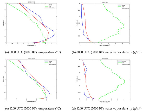 Figure 2 is for case comparison. The four cases given in Table 1 are shown in Figure 2 in chronological order. Their times are sequentially 2010011800, representing 0000 UTC (0800 BT for local time) on 18 January 2010, and 2010020212, 2010072400, and 2011123112, respectively. Three of the four cases are from winter and one is from summer, because LV2 is even worse in winter than in summer after we review all of the cases from the two years. It is well-known that Beijing is cool and dry in winter, and a temperature inversion layer would occur due to the diurnal variation of the surface temperature [30]. The temperature inversion layer increases the difficulty of temperature remote sensing. The difficulty for humidity remote sensing is the dry feature in winter, and the output from LV2 is often wetter than the RAOB.