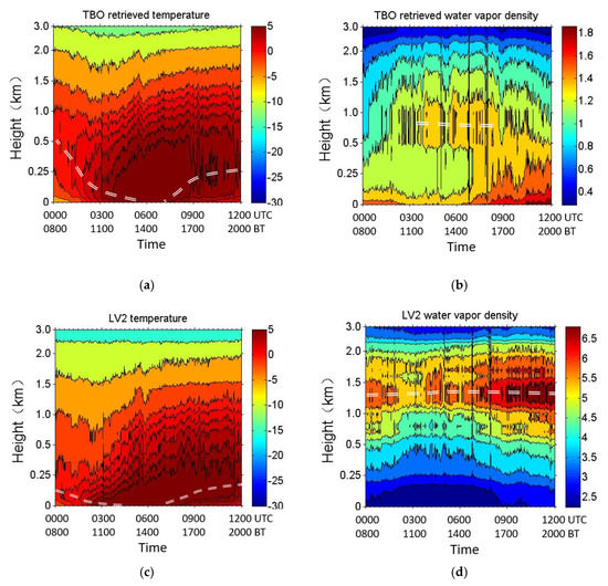 Temperature and humidity profiles with a 2-min resolution during 0000–1200 UTC (0800–2000 BT) on 18 December 2010, supplied by this study as compared with LV2. (a) temperature retrievals from TBO; (b) water vapor density retrieval from TBO; (c) temperature (°C) of LV2; (d) water vapor density (g/m3) of LV2.