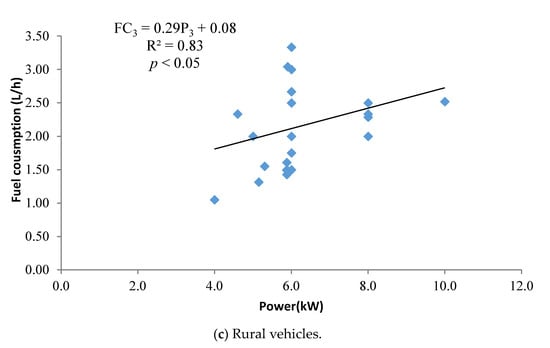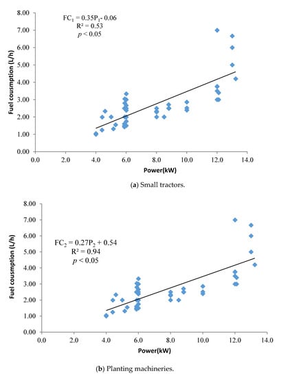 The hourly fuel consumption rates of small tractors, planting equipment and rural vehicles could be obtained from the equations in Figure 2. Table 2 presents estimated fuel consumption rates of the other six types of AM which were not covered in the survey responses. Thus, an average value was obtained for each type of AM (Table 1) and used in the calculation of annul fuel consumption (Table 4).