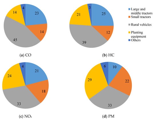 Based on the annual fuel consumption (Table 4) and corresponding emission factors (Table 5), the estimated air emissions for 2013 from AM were 57 Gg of CO, 14 Gg of HC, 74 Gg of NOx and 5.7 Gg of PM in Anhui. As shown in Figure 3, the vast majority (94%) of total emissions were from four AM types: large and medium tractors, small tractors, rural vehicles and planting machineries. Among these four AMs, rural vehicles ranked first in all four pollutants, and accounted for at least 33% of total emissions.