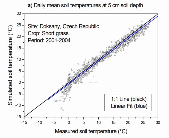 Soil temperature plays an important role in many soil processes and is related to atmospheric, soil and surface conditions. Temperature as one of the driving factors of soil genesis was recognized in the late 19th century by Dokuchaev [1] and independently by Hilgard [2], who listed climate, plants and organisms, the parent material and time as key soil-forming factors. Later, for example, Ellenberg [3] and Gray et al. [4] showed there is a dominant influence of climate and parent material on numerous soil properties. The soil properties, in turn, influence the water and energy transfer, which directly affect the soil temperature, then directly determine the activity levels and survival of soil fauna and flora [5]. Soil temperature measurements are critical for calibrating many soil temperature response functions in simulation models [6], since soil temperature and water content affect physical, chemical and soil biological processes [7,8]. A good performance of soil temperature simulation is therefore very important, especially for crop models, which include nutrient balance or models simulating leaching processes and gas emissions from soils. For example, the soil carbon (C) and nitrogen (N) balance is determined by soil temperature and water content [9,10,11], because they regulate the rate of N-mineralization and, further, the emission of gases from soils [12,13]; C/N balance models are a critical part of most crop growth models, e.g., [14,15]. Many related phenomena are related closely to soil temperatures, such as the effects on soil properties [16], the soil carbon balance under climate change [17], etc. As soil properties and surface conditions vary significantly over space, this creates a big challenge for representative site-specific soil temperature simulations [18,19] as well as for spatial applications of soil temperature models, as shown by, e.g., [6]. Most of the data on near-ground atmospheric conditions are available from in situ weather stations, which are irregularly distributed, creating substantial uncertainties about the spatial distribution, especially for precipitation. However, soil properties and important surface conditions, such as snow cover and plant canopy characteristics [20,21] that influence soil temperatures, are much more difficult to estimate due to their even stronger spatial variability.