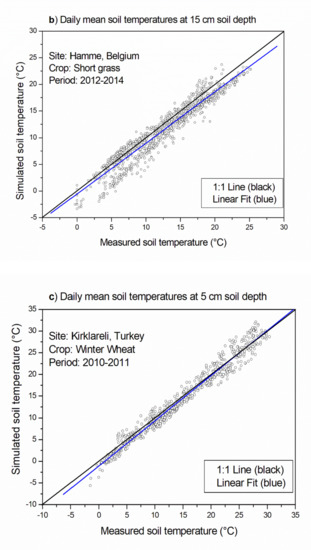 Inventory of different soil temperature (sub)models of SVAT models offer comprehensive modeling of physical processes by describing soil surface-atmosphere energy transfer and simulating the soil temperature on different levels [39,40,41]. Due to the time scales of the driving processes (surface exchange of short-wave and long-wave radiation), hourly meteorological data are used. On the other hand, for the process-oriented models used in crop production (such as crop growth and yield models, pest models, irrigation models, agrometeorological models) and for site-specific or spatial applications, only limited sets of hourly input data are available [42]. However, these are not necessary because a daily simulation time step is sufficient for most of these applications [43]. For example, the daily course of temperatures can be assessed from daily extremes of air temperatures. In regard to soil conditions, short-term variations in precipitation, air temperature, or radiation and their impact on soil temperature and wetness are buffered in the soil column, averaging out short-term variations that could affect simulated ecological processes.