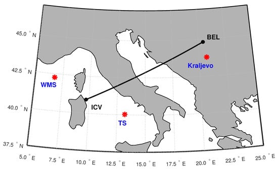 Propagation paths of the VLF signals recorded by the Belgrade receiver station (BEL) in Serbia and emitted by the transmitters ICV in Italy. Locations of the main considered EQs are shown as stars. One EQ occurred in the Tyrrhenian Sea (TS) and Western Mediterranean Sea (WMS), while two EQs were near Kraljevo (their epicentres are shown by the same star).
