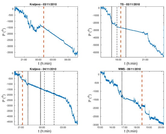 Figure 2. Time evolutions of the unwrapped phase P for the considered periods. Red lines represent the main EQ considered in corresponding time periods. The additional events listed in Table 1 are coloured in black. Times of the additional considered EQ events with magnitude below 2.5, from 2.5 to 3, and from 3 to 4 are represented by thin dotted, thin dashed and tick dotted black lines, respectively. - Determination of the phase noise. To obtain the noise of the unwrapped phase P we calculate its deviation from the basic phase at time t. Here, is obtained in a procedure described in [33] as the mean value of unwrapped phase in the defined time bins around time t. Finally, noise of P is determined as the maximum of after elimination of the largest p percent of its values. To find this value, we first sorted the values of into an ascending array of N members, and determined the value of the phase noise as the value of the term that is in this array:In this study we use like in [33].