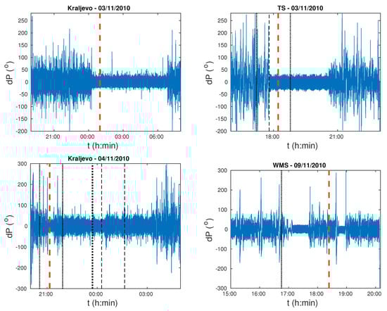 Time evolutions of deviation of the wrapped phase from its basic values dP and the phase noise obtained by the proposed methodology are shown in Figure 3 and Figure 4, respectively. As one can see, reduction of the phase noise is recorded for all four main EQ events and it is clearly visible in the first two cases whose magnitudes are greater than 5.