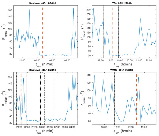 It is worth noting that after the first EQ event near Kraljevo which occurred on 3 November 2010, additional 31 EQs occurred in areas near the considered signal propagation path. Twenty nine of them occurred when the phase noise reduction is clearly visible, while two events of weak intensities (magnitudes of 2.1 and 2.2) occurred after increasing of the phase noise. The most intensive additional EQ had magnitude of 3.3. However, despite the large number of accompanying earthquakes, no significant variations were observed either in dP or in . The absence of these variations is also noticeable in the second case (EQ in Tyrrhenian Sea of magnitude 5.1) when three more earthquakes (magnitudes of 2, 2.1 and 2.5) were recorded within about 1.5 h.