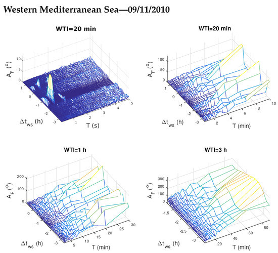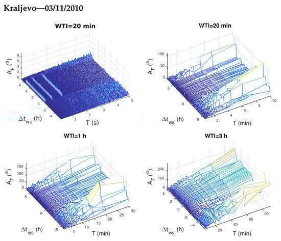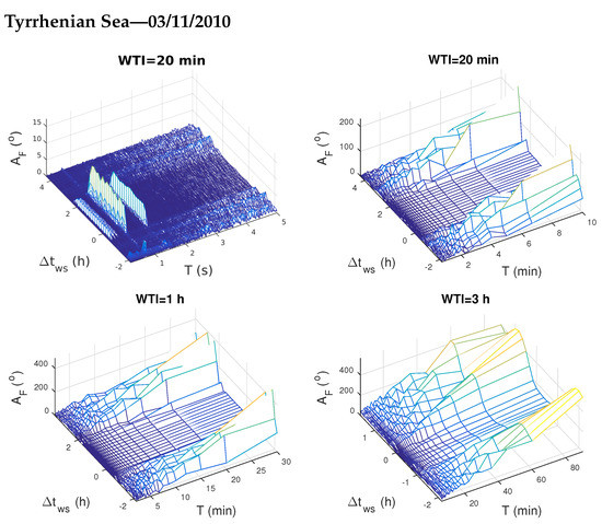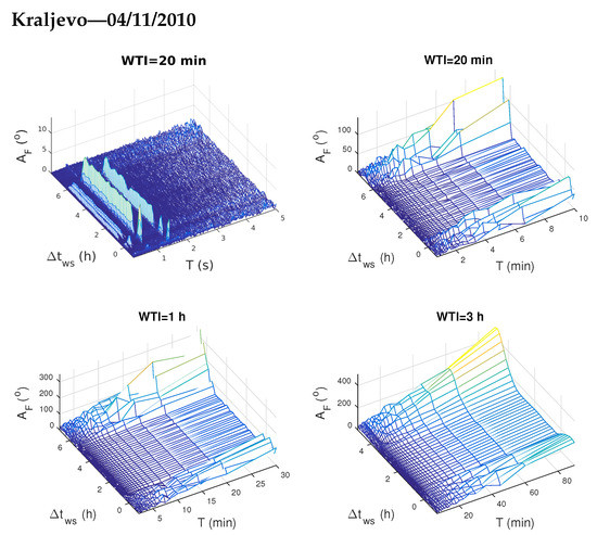 To better visualize periods of the excited/attenuated waves we apply the same procedures like in [33]: (1) we consider three WTI of 20 min, 1 h and 3 h and, (2) in order to better present changes for smaller and greater wave periods T, the obtained values for all WTIs are considered for smaller and greater wave period domains separately. In this study we showed lower periods T for the first WTI, and greater periods for all the three WTIs. The results of the analyses for the considered four time periods are shown in Figure 5, Figure 6, Figure 7 and Figure 8.