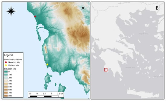 Map A showing Messina, the southwest region of Peloponnese (mark with a red square in Map B), in the south west of Greece. NEO is situated at the coast about 11 km north the nearest city Pylos. The Methoni site is about 11 km south Pylos.