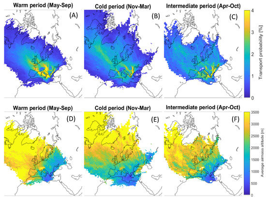 Top panel; Transport source area characteristics, last 240 h, for the warm period, May–September (A), cold period November–March (B) and transition months April and October (C). Bottom panel; Transport average altitude characteristics, last 240 h, for the warm period (D), cold period (E) and transition months (F).