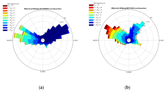 (a,b) a/Local wind roses for Navarino (left panel) and b/Methoni (right panel). Navarino 2011–2013 and Methoni 2014–2016.