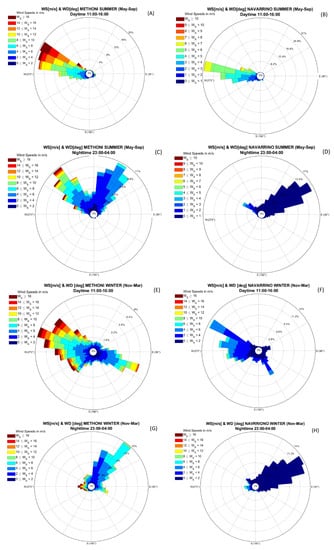 Local wind roses for Methoni (A,C,E,G) and Navarino (B,D,F,H). The warm season daytime is on the top row while night time is 2nd row. The wind roses for the cold season daytime is 3rd while nighttime is on the 4th row.