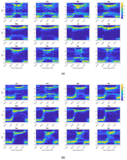 The sea-land breeze circulation is a consistent feature during the whole year, only somewhat weakened during October to December. The shift as observed in wind direction at Navarino (see Figure 5b) between land-sea to sea-land breeze occurs about 2 h after sunrise. This shift is delayed somewhat during October to December. The shift back in the evening occurs about within 2 h after sunset during the warm period, i.e., May to September while during the rest of the year it occurs within an hour after sunset. The wind speed during the day reach about 4–5 m/s during the warm period while it is somewhat lower, about 2–3 m/s during the rest of the year (Figure 5c). At Methoni, the sea breeze during the warm period equally often is interrupted during night by a NEN wind except during June when the sea breeze is still steady through the night (Figure 5a). The wind speed slows down during night but not below 2 m/s (Figure 5c). During the cold period the wind direction is WNW or ESE mostly during the day but change during night time to NE, but the wind speed stays consistently at about 2–3 m/s (Figure 5a,c).